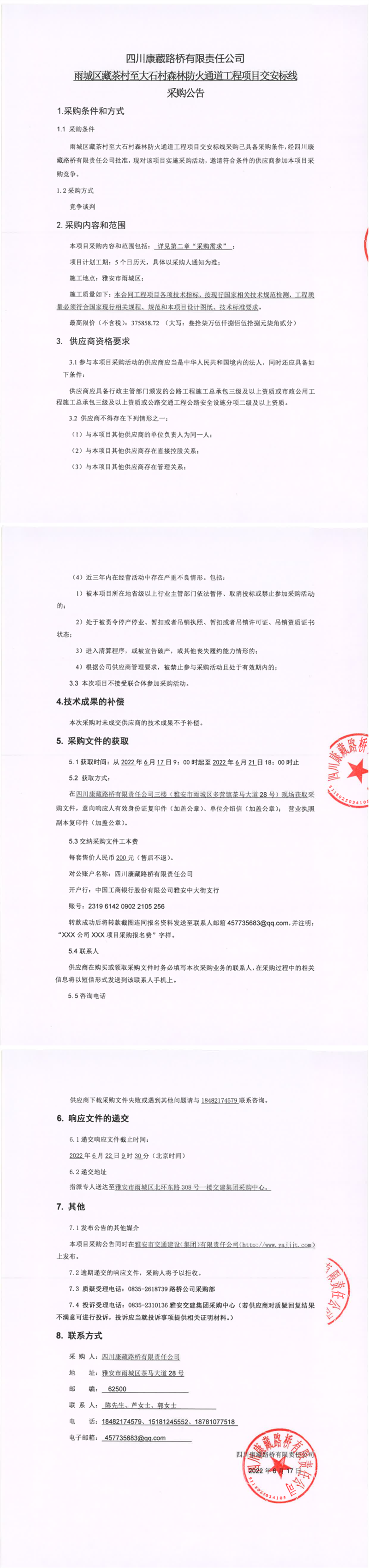四川康藏路橋有限責(zé)任公司雨城區(qū)藏茶村至大石村森林防火通道工程項(xiàng)目交安標(biāo)線采購(gòu)公告
