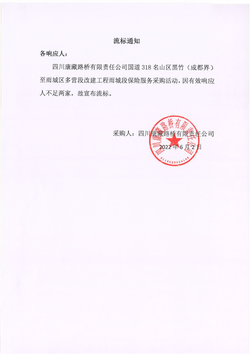 四川康藏路橋有限責任公司國道318名山區(qū)黑竹(成都界)至雨城區(qū)多營段改建工程雨城段保險服務(wù)采購流標通知