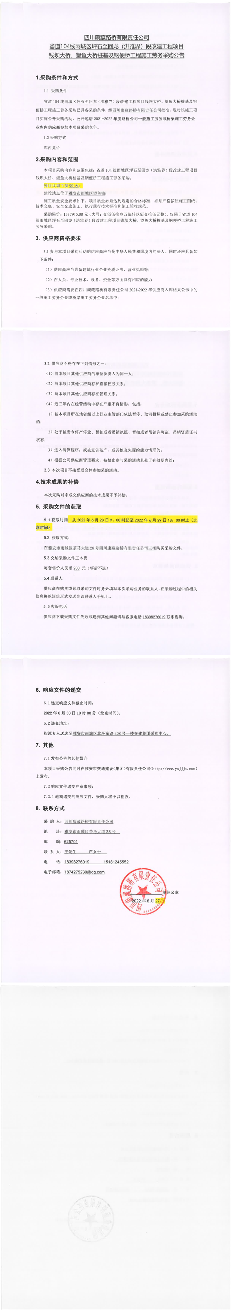 四川康藏路橋有限責(zé)任公司省道104線雨城區(qū)坪石至回龍(洪雅界)段改建工程項(xiàng)目錢壩大橋、望魚大橋樁基及鋼便橋工程施工勞務(wù)采購公告