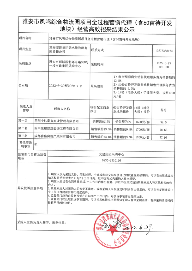 雅安交建集團(tuán)無水港物流有限責(zé)任公司雅安市鳳鳴綜合物流園項(xiàng)目全過程營(yíng)銷代理(含60畝待開發(fā)地塊)經(jīng)營(yíng)高效招采結(jié)果公示