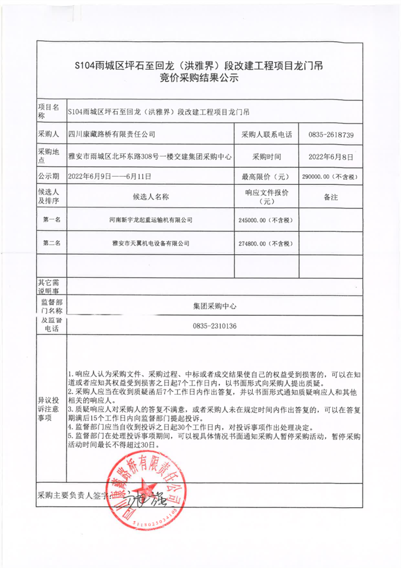 四川康藏路橋有限責任公司S104雨城區(qū)坪石至回龍(洪雅界)段改建工程項目龍門吊競價采購結果公示