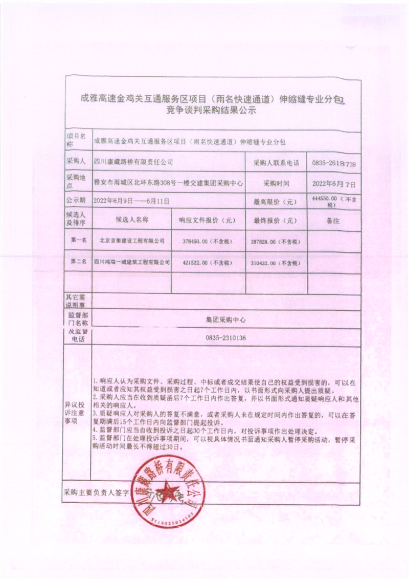 四川康藏路橋有限責(zé)任公司成雅高速金雞關(guān)互通服務(wù)區(qū)項(xiàng)目(雨名快速通道)伸縮縫工程專業(yè)分包競爭談判采購結(jié)果公示