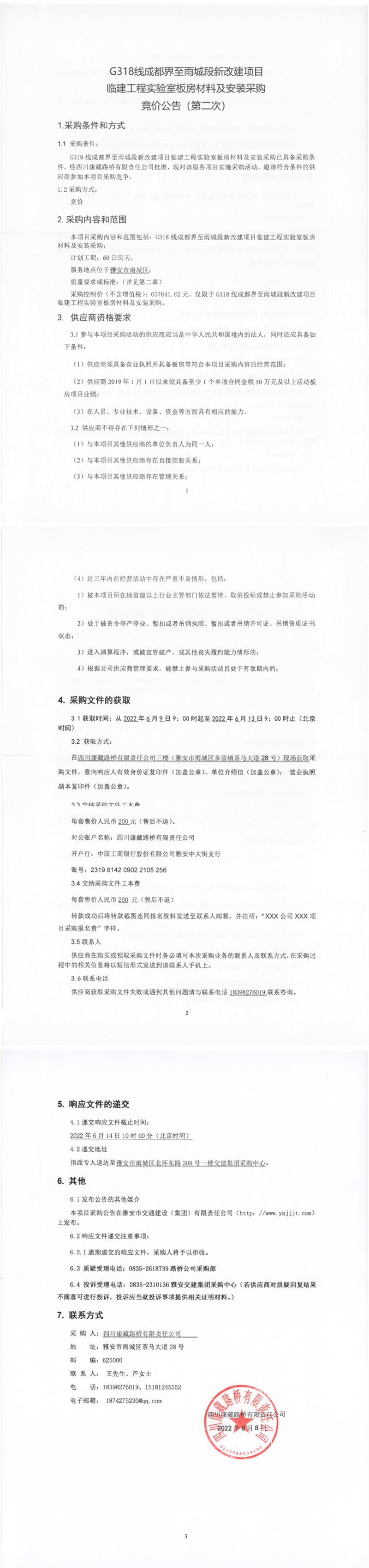 四川康藏路橋有限責(zé)任公司G318線成都界至雨城段新改建項(xiàng)目臨建工程實(shí)驗(yàn)室板房材料及安裝采購競價(jià)公告(第二次)