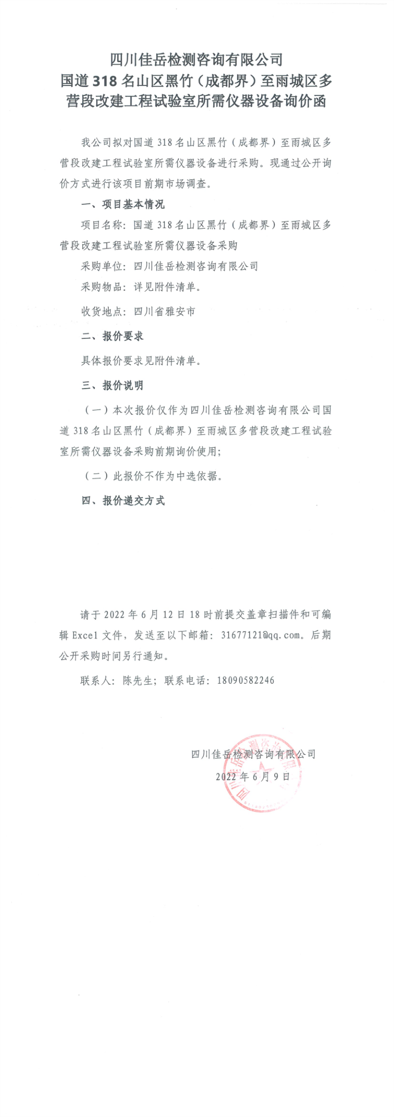 四川佳岳檢測咨詢有限公司國道318名山區(qū)黑竹(成都界)至雨城區(qū)多營段改建工程試驗室所需儀器設備詢價函
