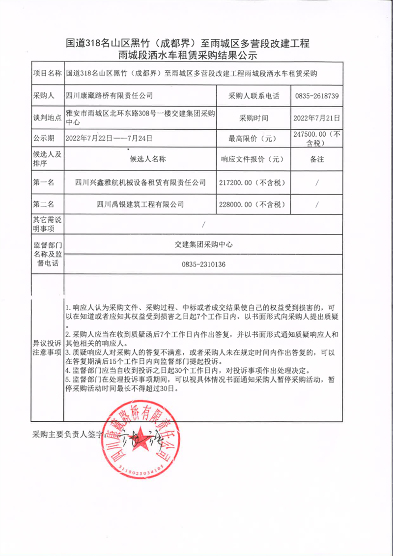 四川康藏路橋有限責(zé)任公司國道318名山區(qū)黑竹(成都界)至雨城區(qū)多營段改建工程雨城段灑水車租賃采購結(jié)果公示