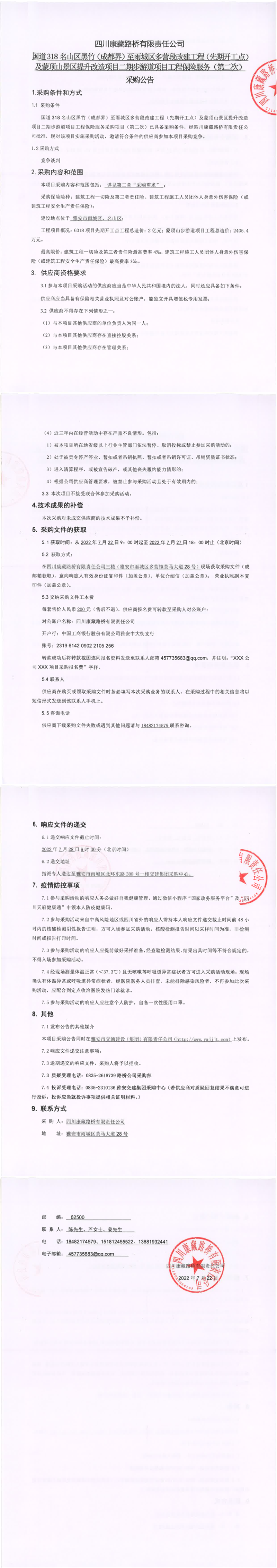 四川康藏路橋有限責(zé)任公司國(guó)道318名山區(qū)黑竹(成都界)至雨城區(qū)多營(yíng)段改建工程(先期開(kāi)工點(diǎn))及蒙頂山景區(qū)提升改造項(xiàng)目二期步游道項(xiàng)目工程保險(xiǎn)服務(wù)(第二次)采購(gòu)公告