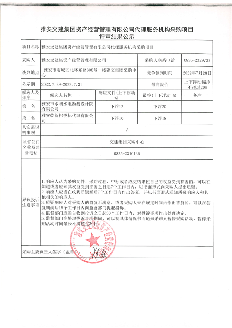 雅安交建集團資產(chǎn)經(jīng)營管理有限公司代理服務(wù)機構(gòu)采購項目評審結(jié)果公示
