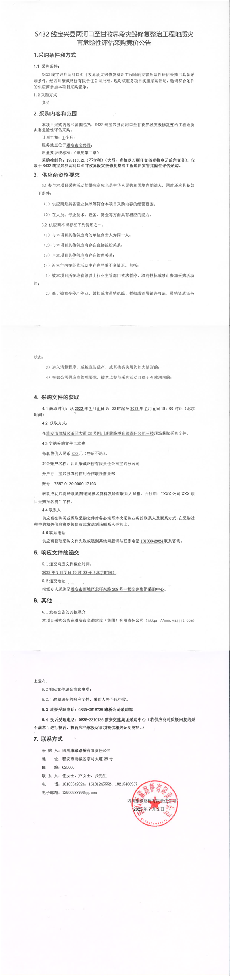 四川康藏路橋有限責(zé)任公司S432線寶興縣兩河口至甘孜界段災(zāi)毀修復(fù)整治工程地質(zhì)災(zāi)害危險(xiǎn)性評(píng)估采購(gòu)競(jìng)價(jià)公告