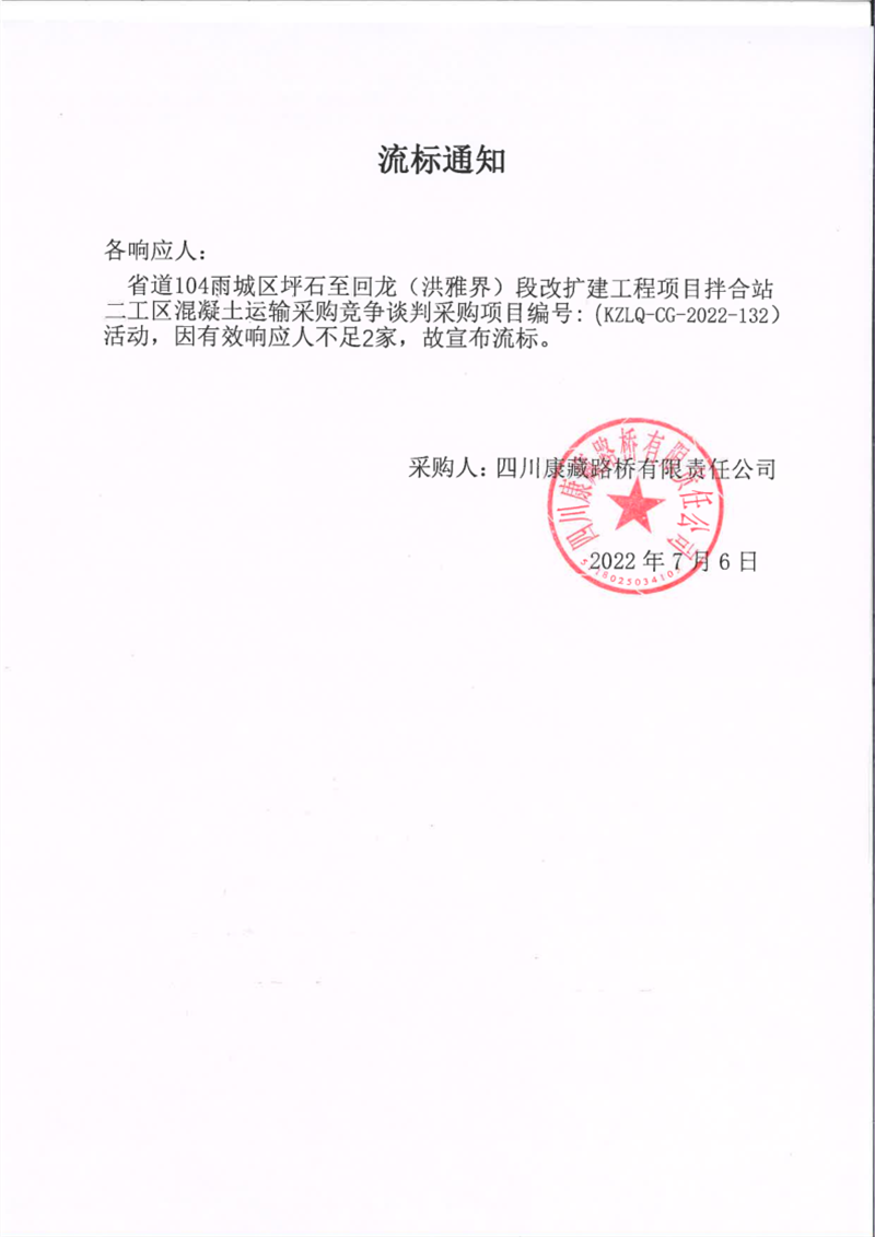 四川康藏路橋有限責(zé)任公司省道104線(xiàn)雨城區(qū)坪石至回龍(洪雅界)段改建工程項(xiàng)目拌合站二工區(qū)混凝土運(yùn)輸采購(gòu)競(jìng)爭(zhēng)談判采購(gòu)項(xiàng)目流標(biāo)通知