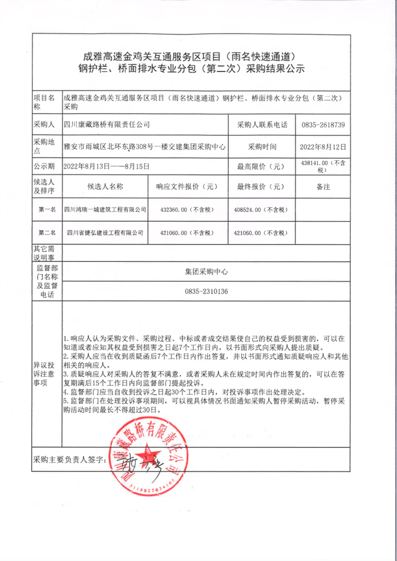 四川康藏路橋有限責任公司成雅高速金雞關互通服務區(qū)項目(雨名快速通道)鋼護欄、橋面排水專業(yè)分包(第二次)采購結果公示