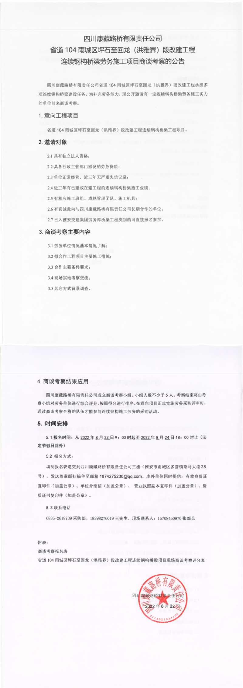 四川康藏路橋有限責(zé)任公司省道104雨城區(qū)坪石至回龍(洪雅界)段改建工程連續(xù)鋼構(gòu)橋梁勞務(wù)施工項(xiàng)目商談考察的公告