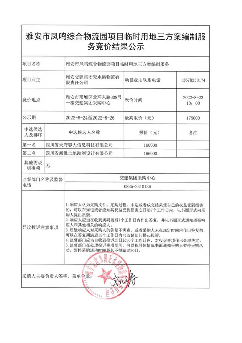 雅安交建集團(tuán)無(wú)水港物流有限責(zé)任公司雅安市鳳鳴綜合物流園項(xiàng)目臨時(shí)用地三方案編制服務(wù)競(jìng)價(jià)結(jié)果公示