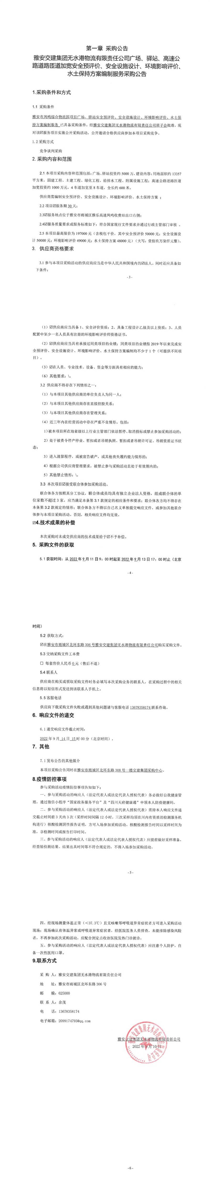 雅安交建集團(tuán)無水港物流有限責(zé)任公司廣場(chǎng)、驛站、高速公路道路匝道加寬安全預(yù)評(píng)價(jià)、安全設(shè)施設(shè)計(jì)、環(huán)境影響評(píng)價(jià)、水土保持方案編制服務(wù)采購公告