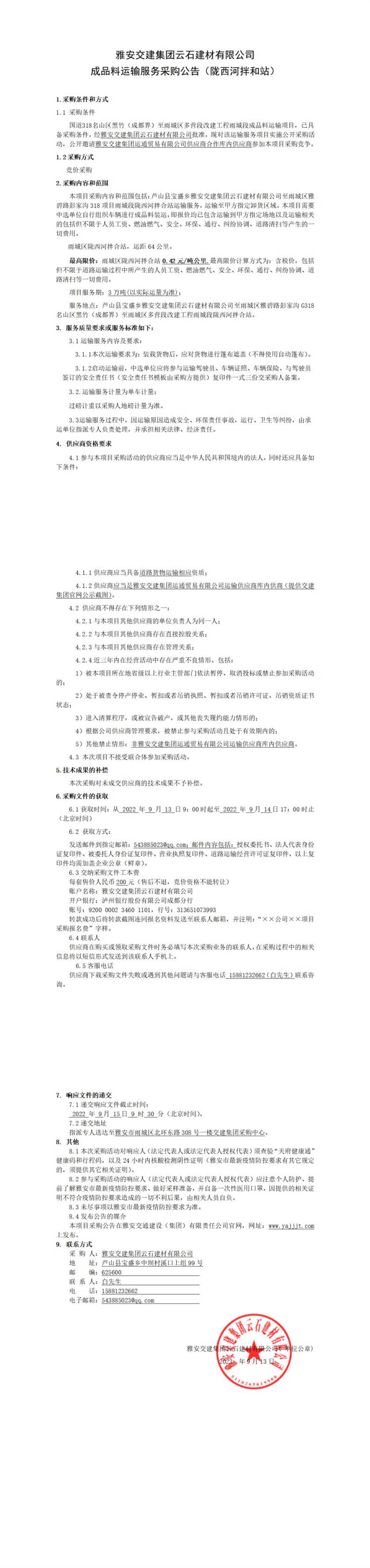 雅安交建集團云石建材有限公司成品料運輸服務采購公告(皇茶大道拌和站)