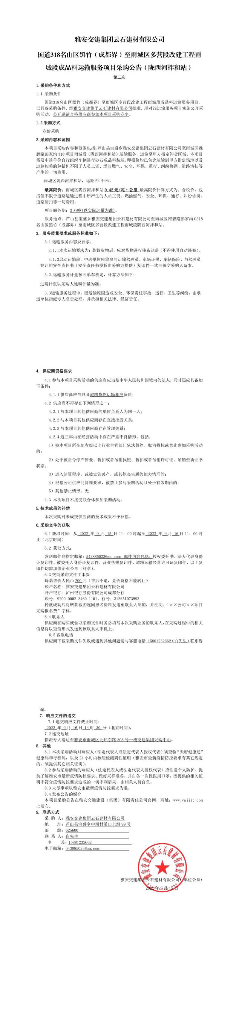 雅安交建集團(tuán)云石建材有限公司國道318名山區(qū)黑竹(成都界)至雨城區(qū)多營段改建工程雨城段成品料運輸服務(wù)項目(隴西河拌和站)競價結(jié)果公示