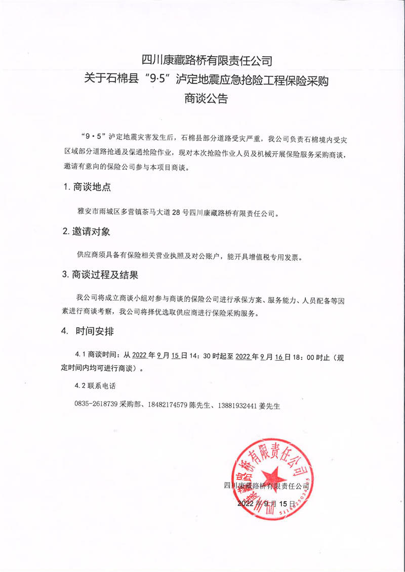 四川康藏路橋有限責任公司關(guān)于石棉縣“9·5”瀘定地震應(yīng)急搶險工程保險采購商談公告