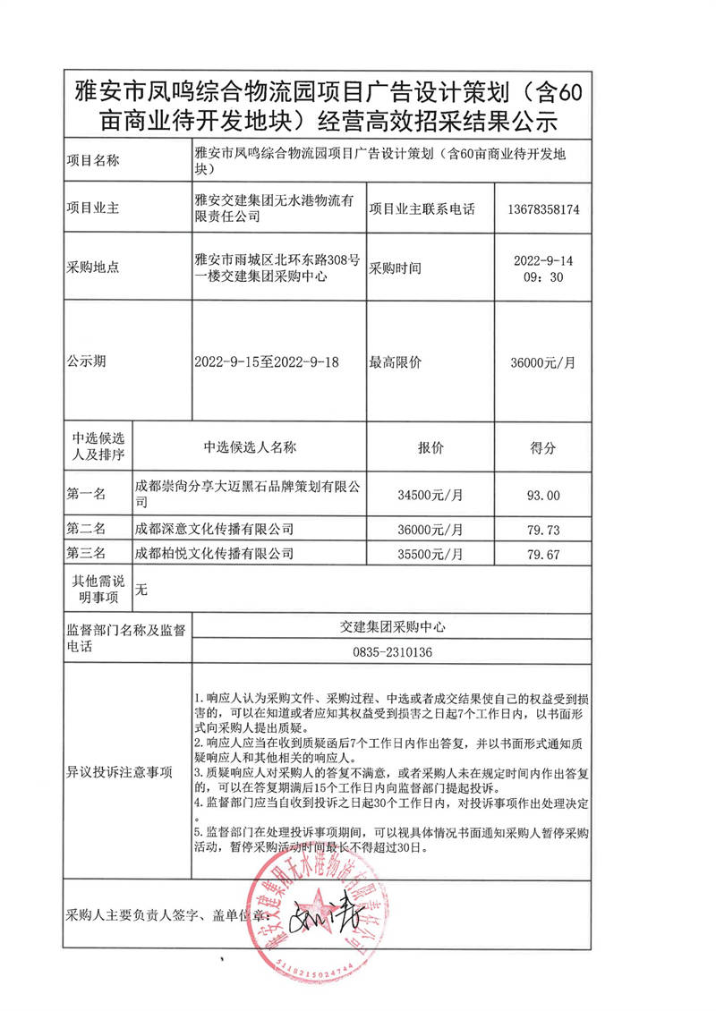 雅安交建集團(tuán)無水港物流有限責(zé)任公司雅安市鳳鳴綜合物流園項目廣告設(shè)計策劃(含60畝商業(yè)待開發(fā)地塊)經(jīng)營高效招采結(jié)果公示