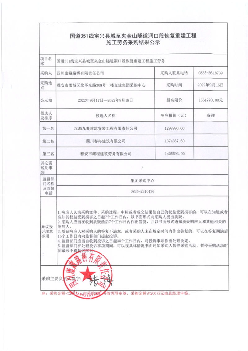 四川康藏路橋有限責任公司國道351線寶興縣城至夾金山隧道洞口段恢復(fù)重建工程施工勞務(wù)采購結(jié)果公示