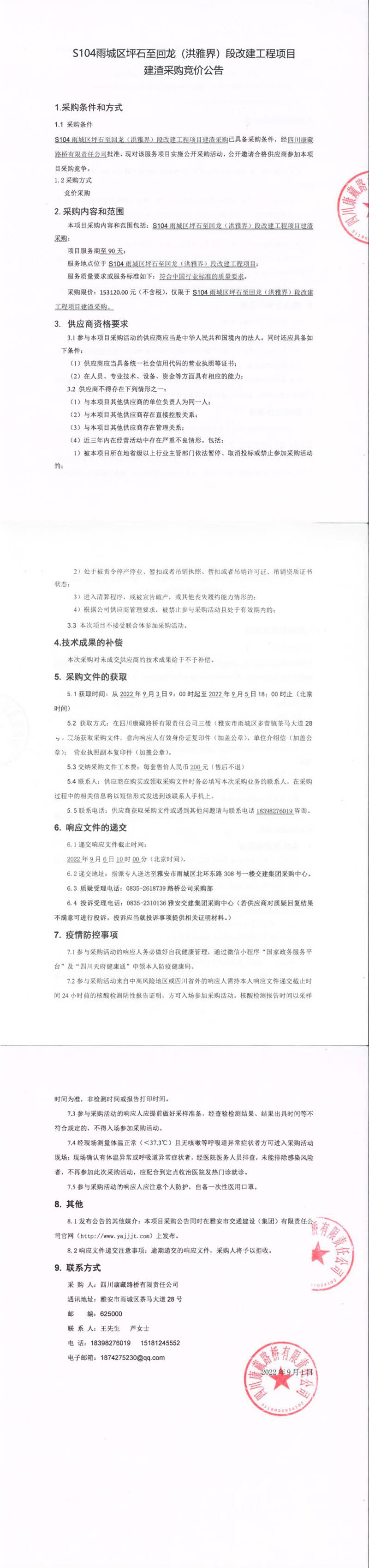 四川康藏路橋有限責(zé)任公司S104雨城區(qū)坪石至回龍(洪雅界)段改建工程項(xiàng)目建渣采購競(jìng)價(jià)公告