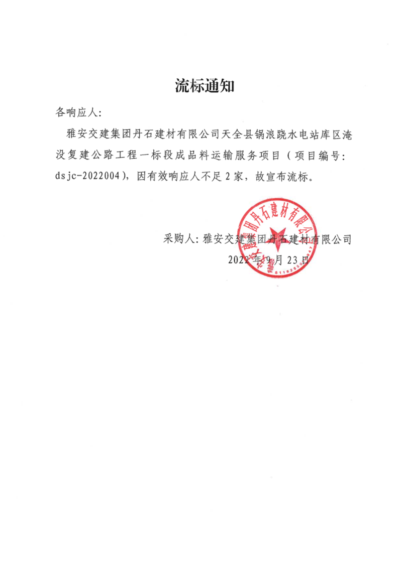 雅安交建集團(tuán)丹石建材有限公司天全縣鍋浪蹺水電站庫區(qū)淹沒復(fù)建公路工程一標(biāo)段成品料運輸服務(wù)項目流標(biāo)通知