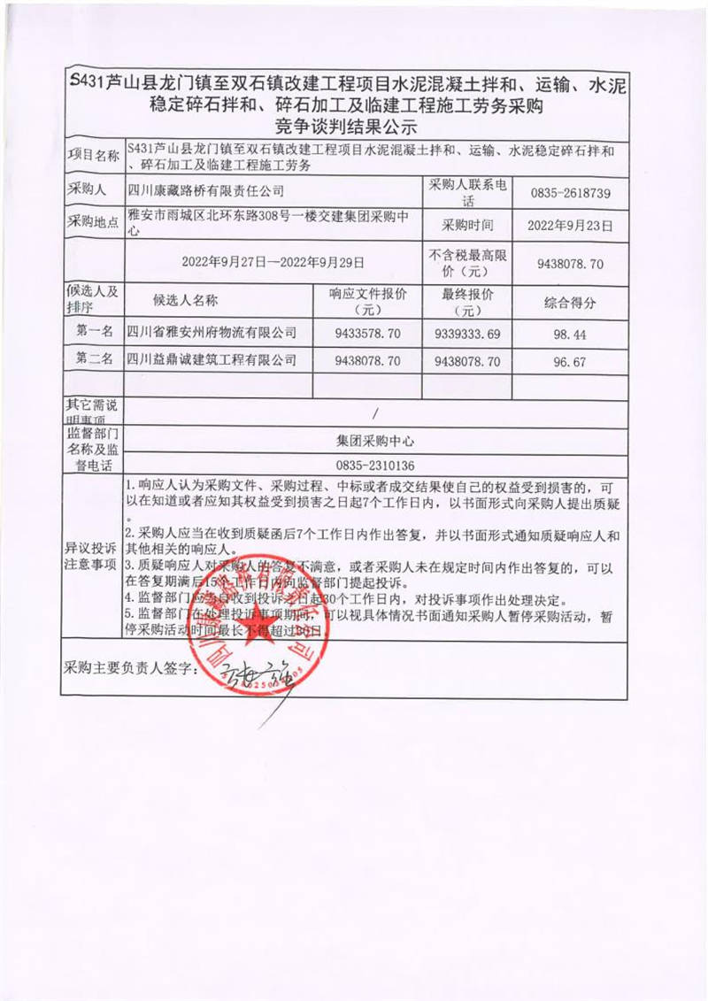四川康藏路橋有限責任公司S431蘆山縣龍門鎮(zhèn)至雙石鎮(zhèn)改建工程項目水泥混凝土拌和、運輸、水泥穩(wěn)定碎石拌和、碎石加工及臨建工程施工勞務采購競爭談判結(jié)果公示