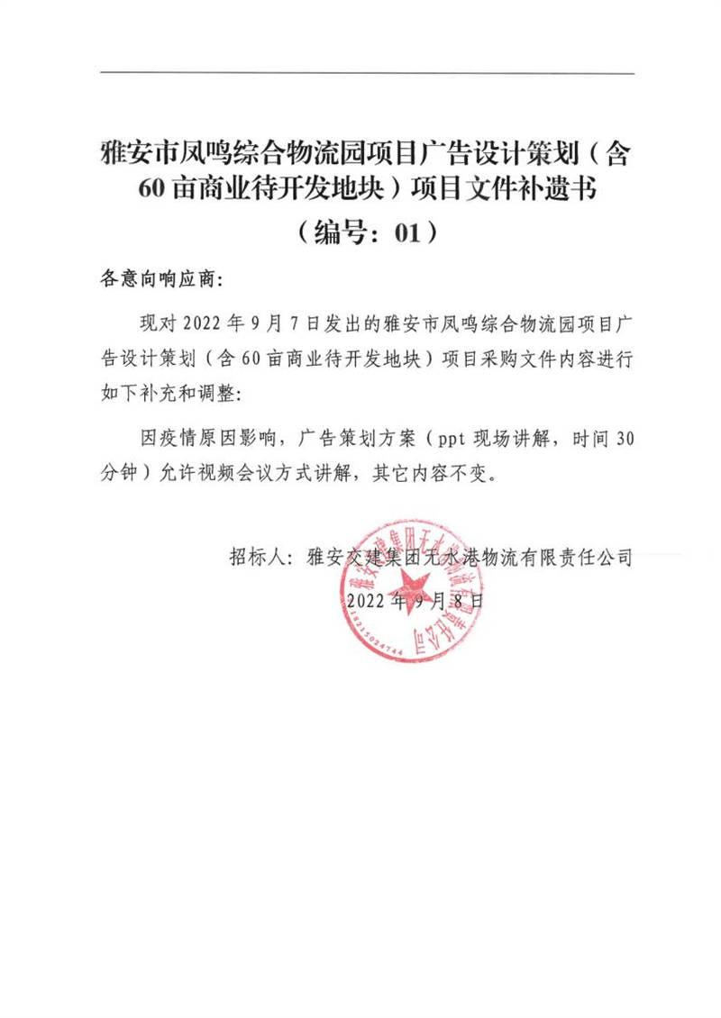 雅安交建集團(tuán)無水港物流有限責(zé)任公司雅安市鳳鳴綜合物流園項(xiàng)目廣告設(shè)計(jì)策劃(含60畝商業(yè)待開發(fā)地塊)項(xiàng)目文件補(bǔ)遺書(編號:01)