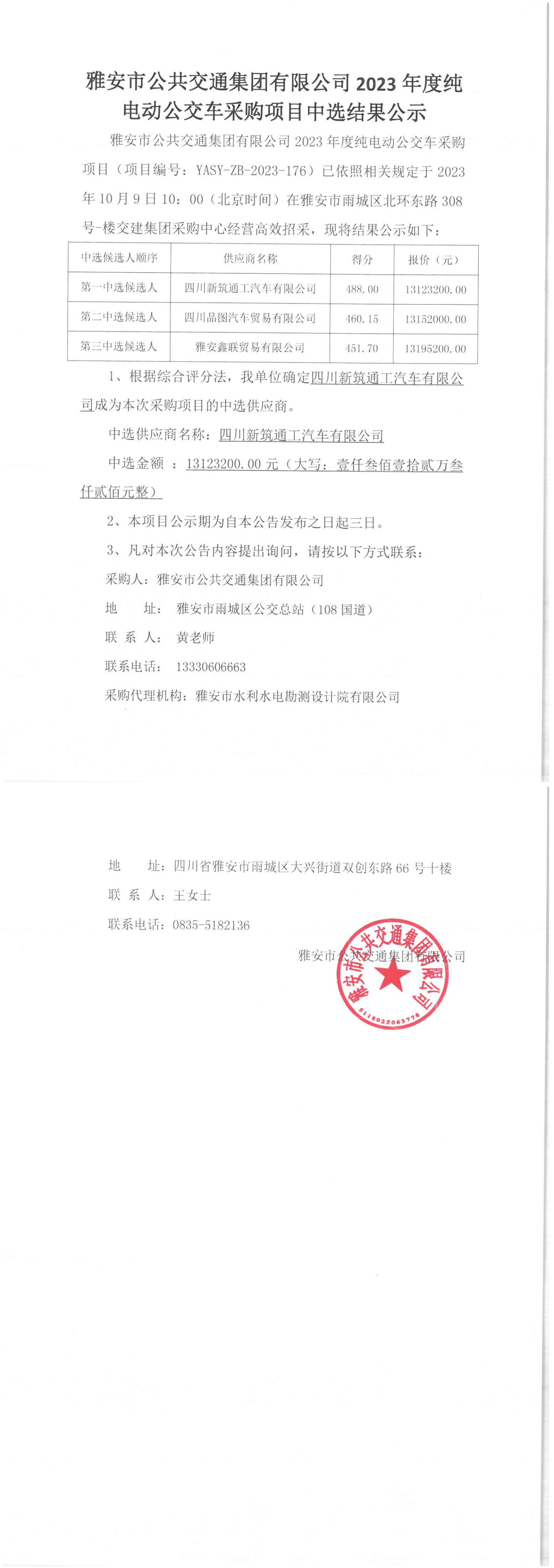 雅安市公共交通集團(tuán)有限公司2023年度純電動(dòng)公交車采購(gòu)項(xiàng)目中選結(jié)果公示