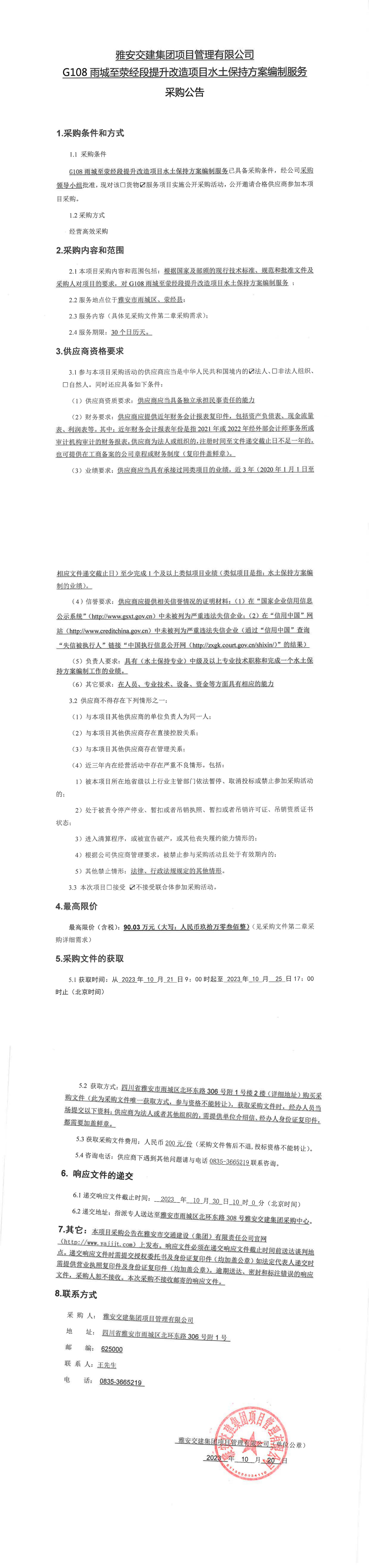 雅安交建集團項目管理有限公司G108雨城至滎經段提升改造項目水土保持方案編制服務采購公告
