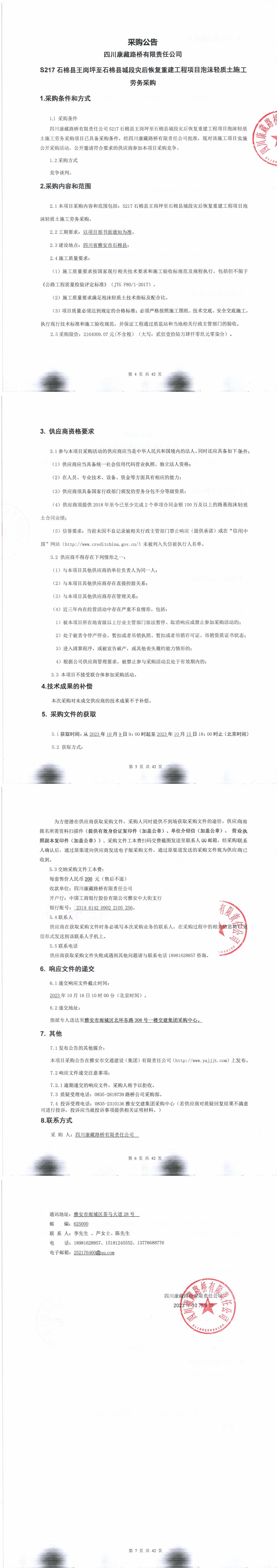 四川康藏路橋有限責(zé)任公司S217石棉縣王崗坪至石棉縣城段災(zāi)后恢復(fù)重建工程項(xiàng)目泡沫輕質(zhì)土施工勞務(wù)采購公告