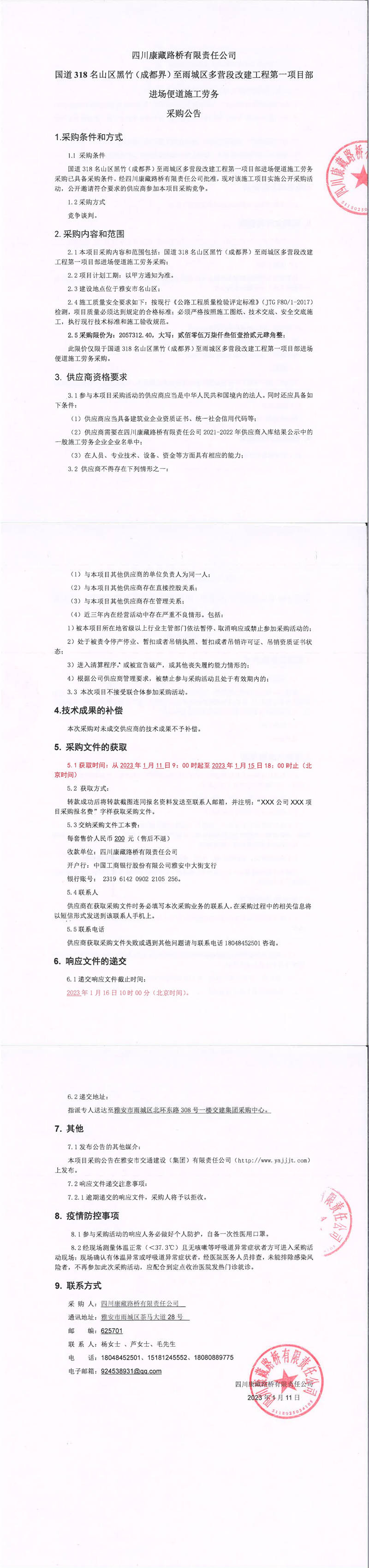 四川康藏路橋有限責(zé)任公司國(guó)道318名山區(qū)黑竹(成都界)至雨城區(qū)多營(yíng)段改建工程第一項(xiàng)目部進(jìn)場(chǎng)便道施工勞務(wù)采購(gòu)公告
