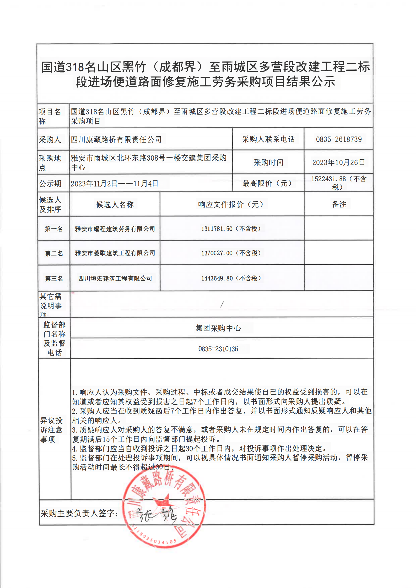 四川康藏路橋有限責(zé)任公司國道318名山區(qū)黑竹(成都界)至雨城區(qū)多營段改建工程二標(biāo)段進(jìn)場(chǎng)便道路面修復(fù)施工勞務(wù)采購項(xiàng)目結(jié)果公示