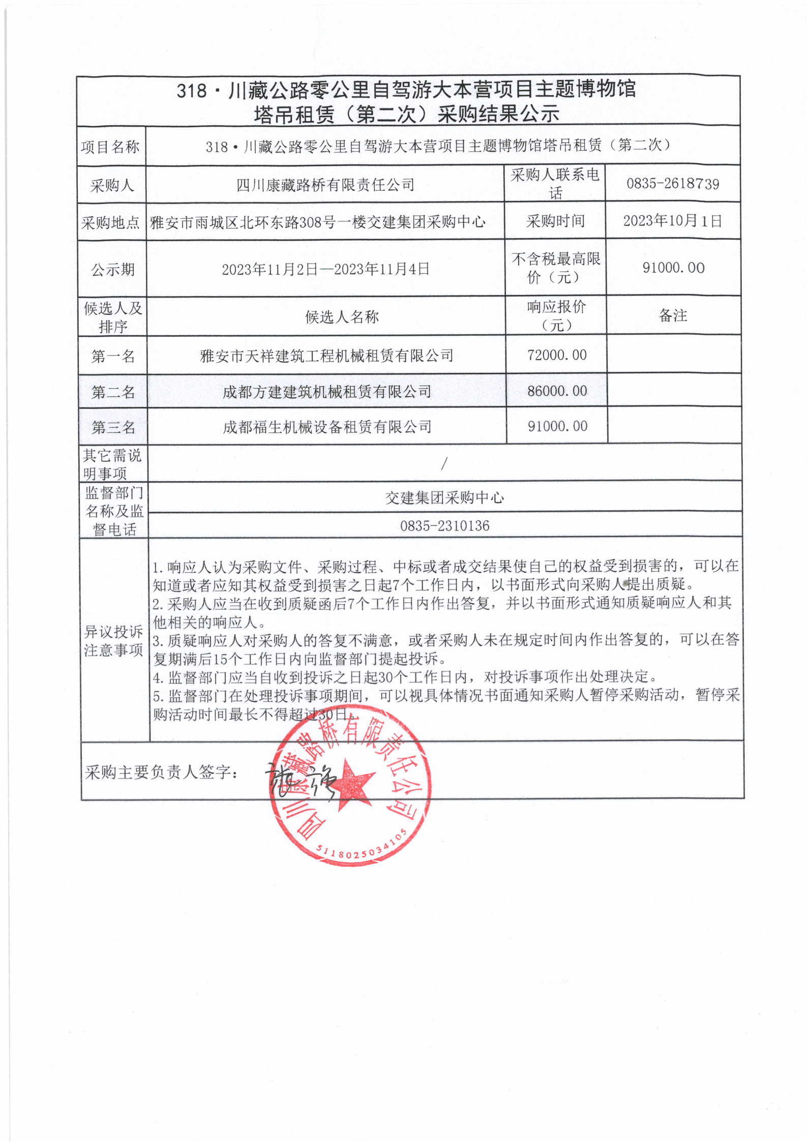 四川康藏路橋有限責(zé)任公司318·川藏公路零公里自駕游大本營項目主題博物館塔吊租賃(第二次)采購結(jié)果公示