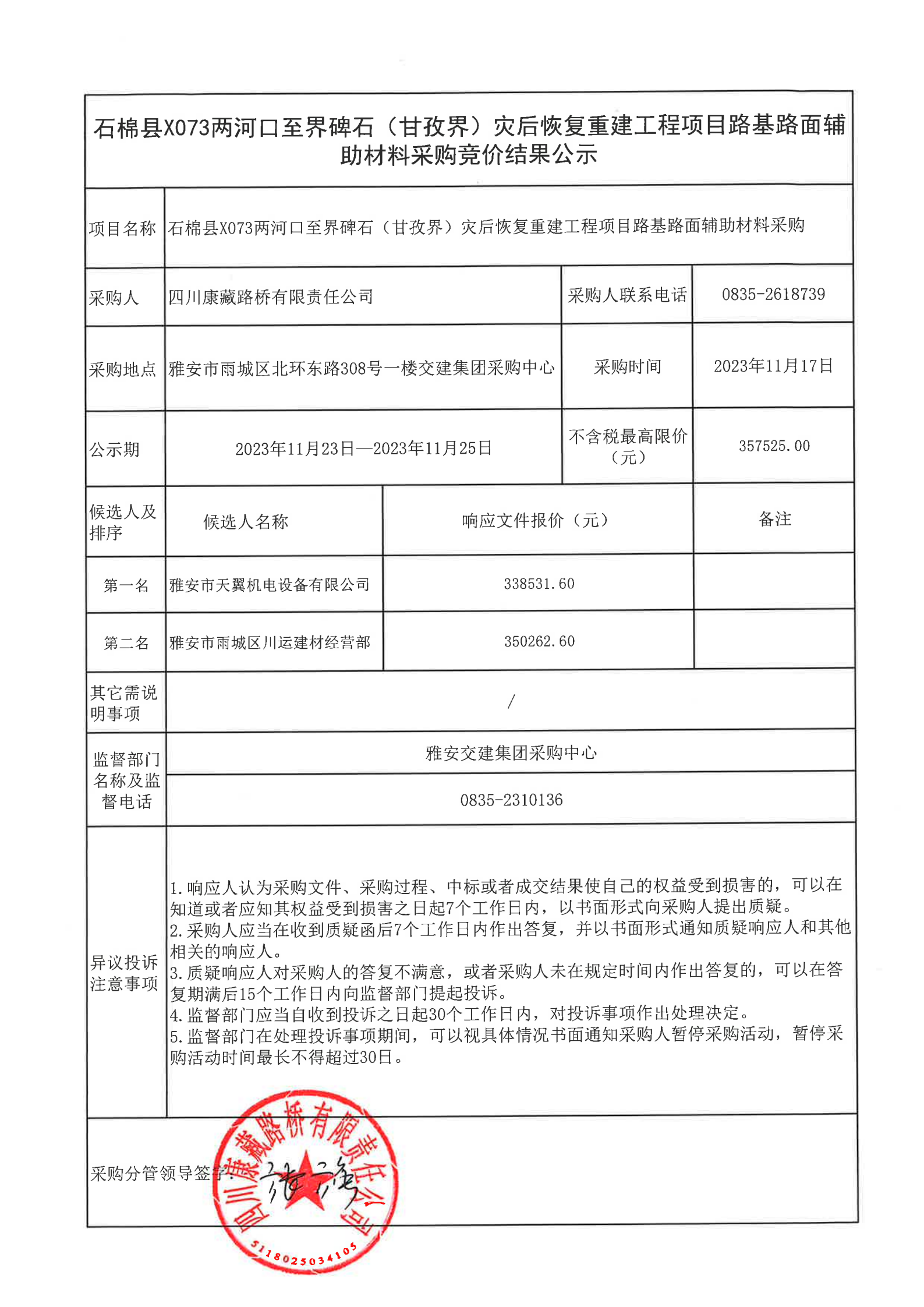 四川康藏路橋有限責任公司石棉縣X073兩河口至界碑石(甘孜界)災后恢復重建工程項目路基路面輔助材料采購結果公示
