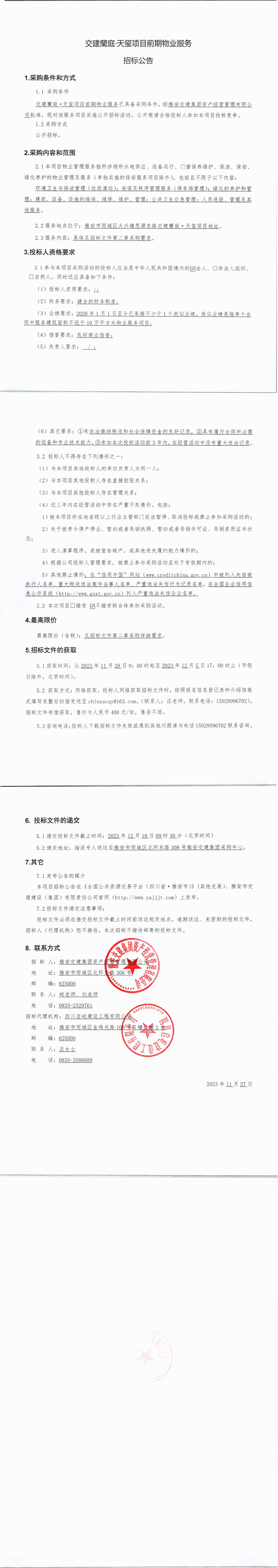 雅安交建集團(tuán)資產(chǎn)經(jīng)營管理有限公司交建蘭庭·天璽項目前期物業(yè)服務(wù)招標(biāo)公告