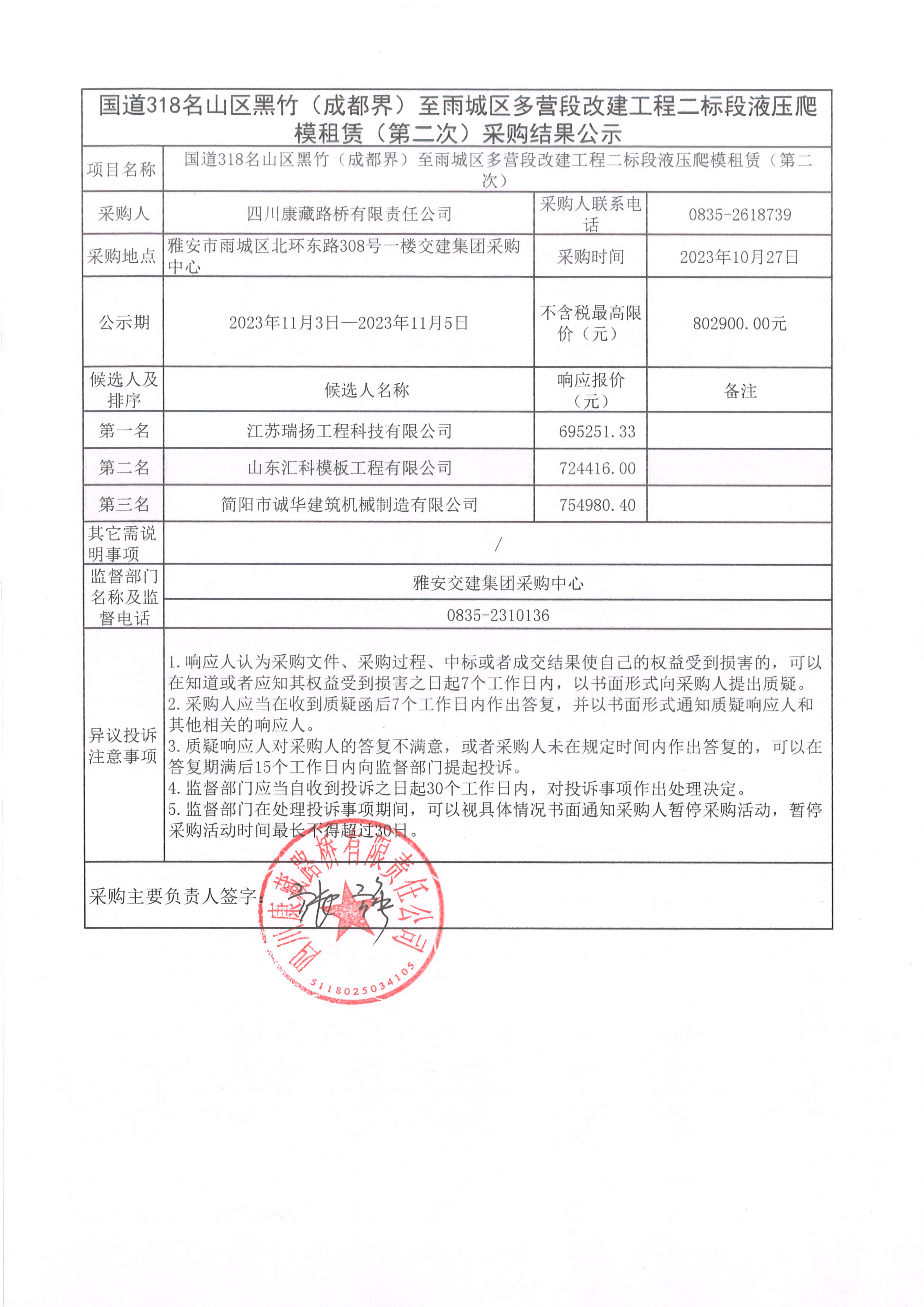 四川康藏路橋有限責(zé)任公司國(guó)道318名山區(qū)黑竹(成都界)至雨城區(qū)多營(yíng)段改建工程二標(biāo)段液壓爬模租賃(第二次)采購(gòu)結(jié)果公示