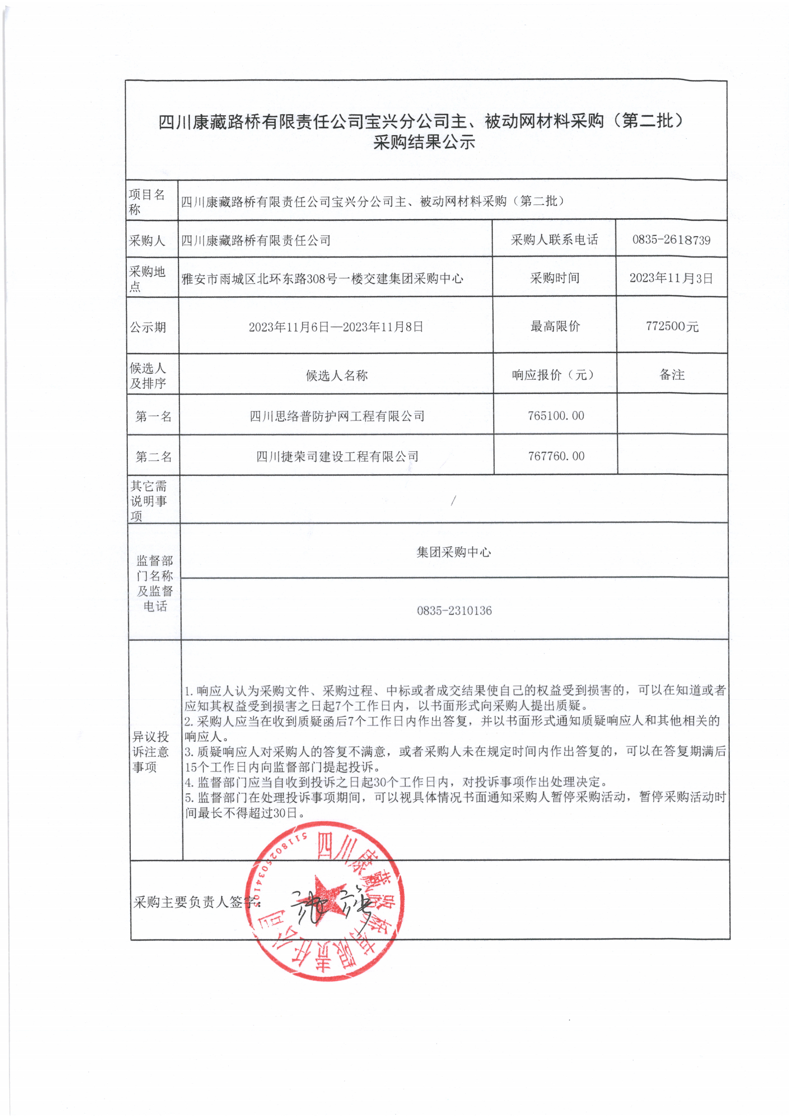 四川康藏路橋有限責任公司寶興分公司主、被動網(wǎng)材料采購(第二批)采購結果公示