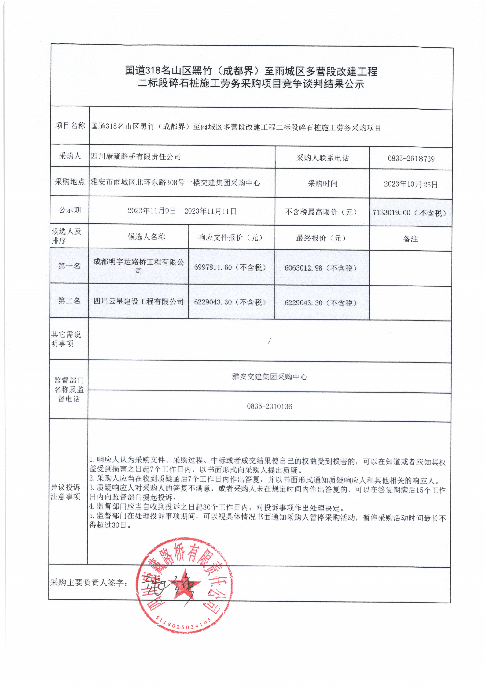 四川康藏路橋有限責(zé)任公司國道318名山區(qū)黑竹(成都界)至雨城區(qū)多營段改建工程二標段碎石樁施工勞務(wù)采購項目競爭談判結(jié)果公示