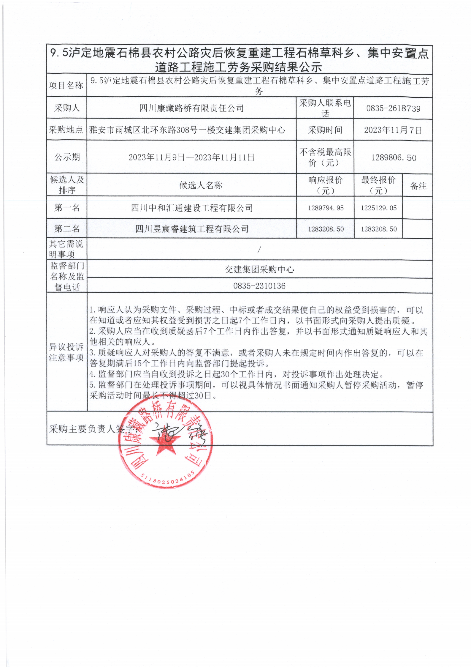 四川康藏路橋有限責(zé)任公司9.5瀘定地震石棉縣農(nóng)村公路災(zāi)后恢復(fù)重建工程剩余工程土建工程施工勞務(wù)采購結(jié)果公示