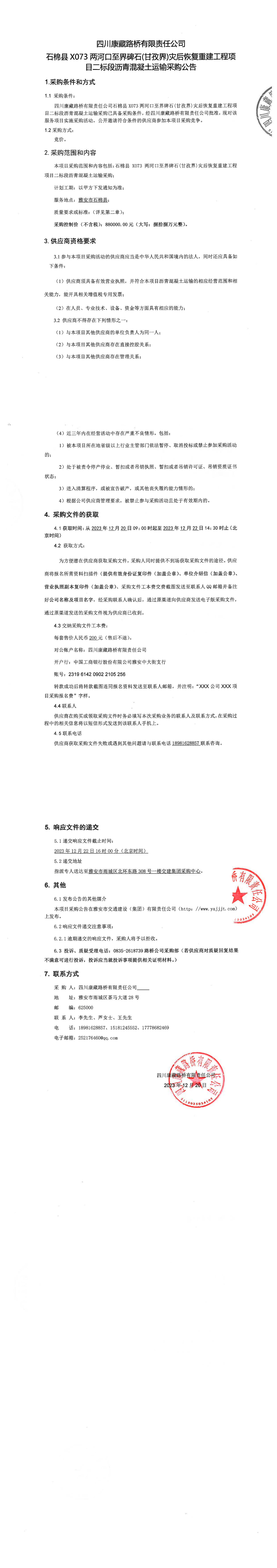 四川康藏路橋有限責(zé)任公司石棉縣X073兩河口至界碑石(甘孜界)災(zāi)后恢復(fù)重建工程項目二標(biāo)段瀝青混凝土運(yùn)輸采購公告