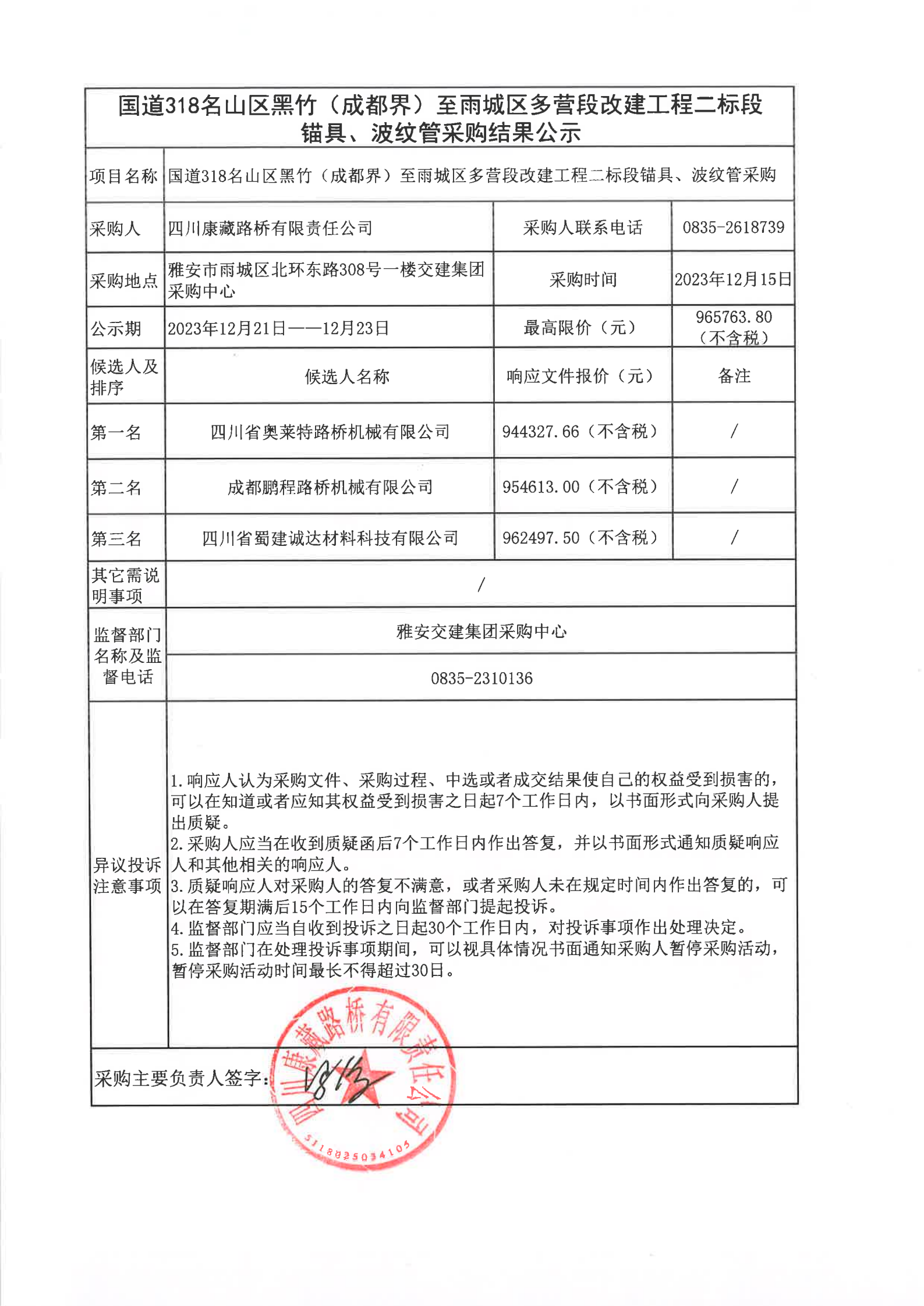四川康藏路橋有限責任公司國道318名山區(qū)黑竹(成都界)至雨城區(qū)多營段改建工程二標段錨具、波紋管采購結(jié)果公示