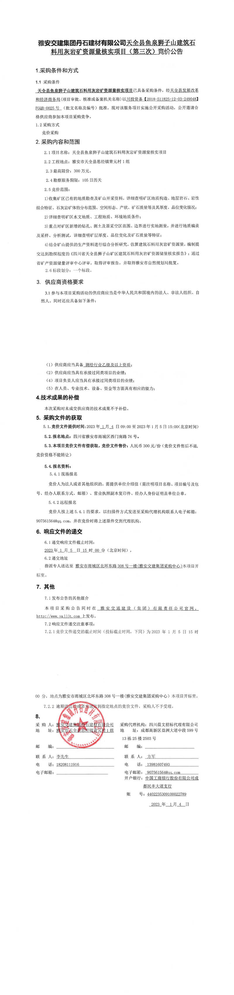 雅安交建集團(tuán)丹石建材有限公司天全縣魚泉獅子山建筑石料用灰?guī)r礦資源量核實(shí)項(xiàng)目(第三次)競價(jià)公告
