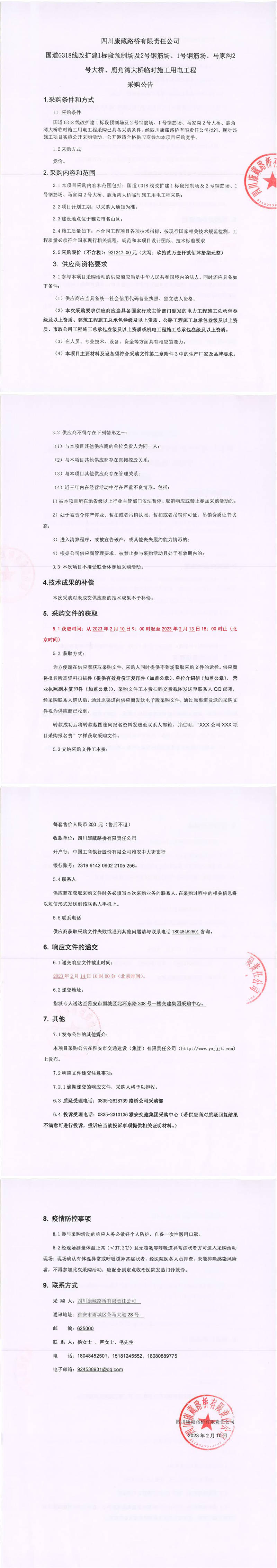 四川康藏路橋有限責(zé)任公司國(guó)道G318線改擴(kuò)建1標(biāo)段預(yù)制場(chǎng)及2號(hào)鋼筋場(chǎng)、1號(hào)鋼筋場(chǎng)、馬家溝2號(hào)大橋、鹿角灣大橋臨時(shí)施工用電工程采購(gòu)公告