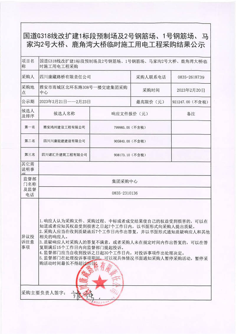 四川康藏路橋有限責任公司國道318線改擴建1標段預制場及2號鋼筋場、1號鋼筋場、馬家溝2號大橋、鹿角灣大橋臨時施工用電工程采購結(jié)果公示
