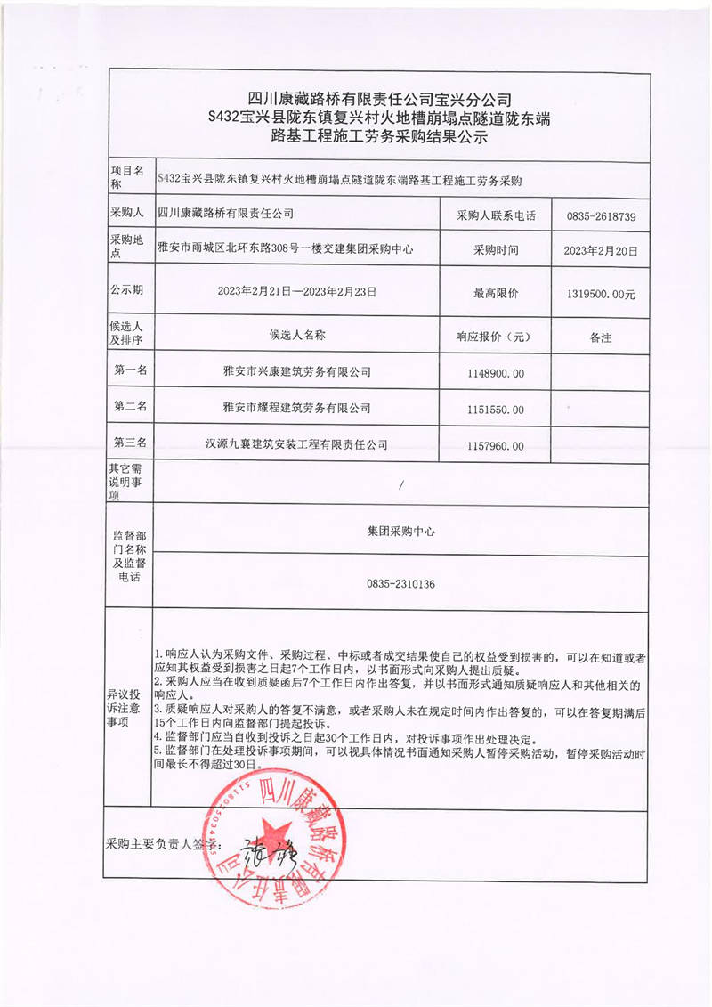 四川康藏路橋有限責(zé)任公司寶興分公司S432寶興縣隴東鎮(zhèn)復(fù)興村火地槽崩塌點(diǎn)隧道隴東端路基工程施工勞務(wù)采購結(jié)果公示