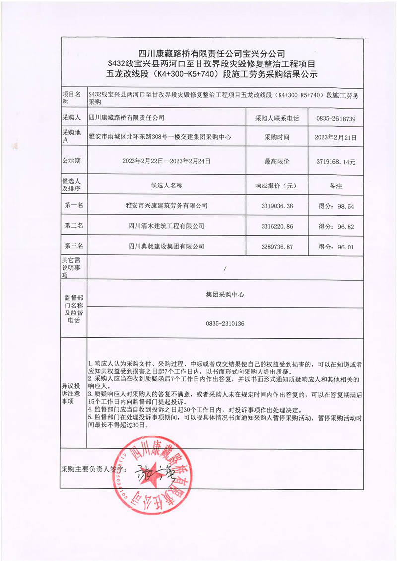 四川康藏路橋有限責(zé)任公司寶興分公司S432寶興縣兩河口至甘孜界段災(zāi)毀修復(fù)整治工程項(xiàng)目五龍改線段(K4+300-K5+740)段施工勞務(wù)采購結(jié)果公示