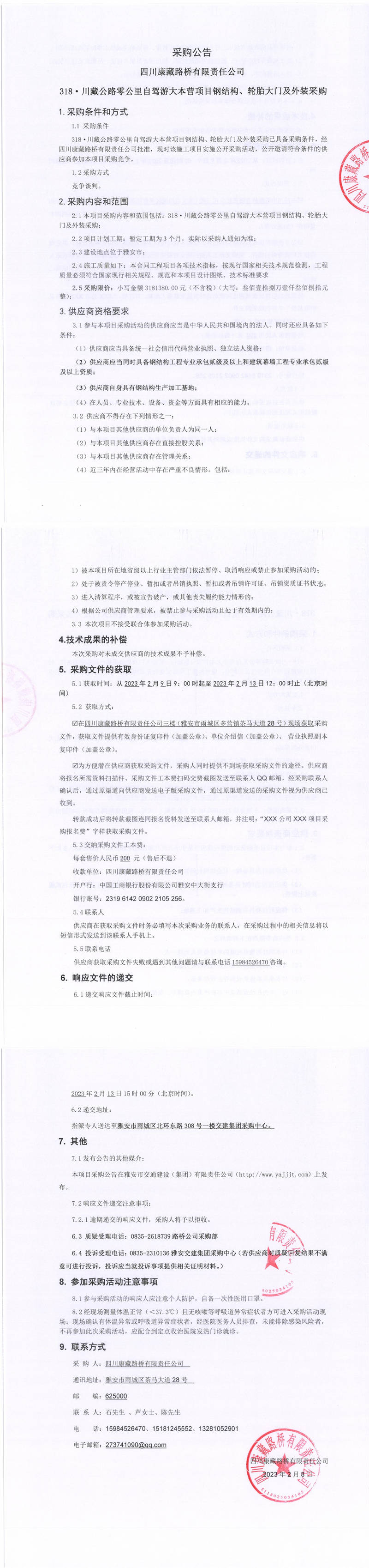 四川康藏路橋有限責(zé)任公司318.川藏公路零公里自駕游大本營項目鋼結(jié)構(gòu)、輪胎大門及外裝采購采購公告