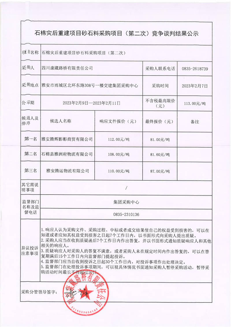 四川康藏路橋有限責(zé)任公司石棉災(zāi)后重建項(xiàng)目砂石料采購項(xiàng)目(第二次)競爭談判結(jié)果公示