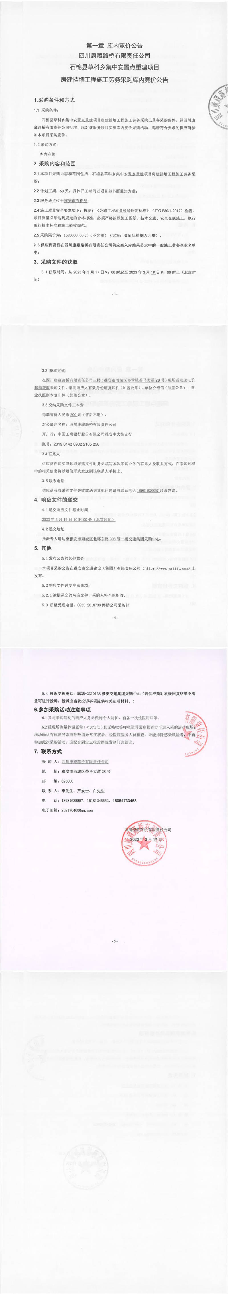 四川康藏路橋有限責(zé)任公司石棉草科鄉(xiāng)集中安置點重建項目房建擋墻工程施工勞務(wù)采購庫內(nèi)競價公告