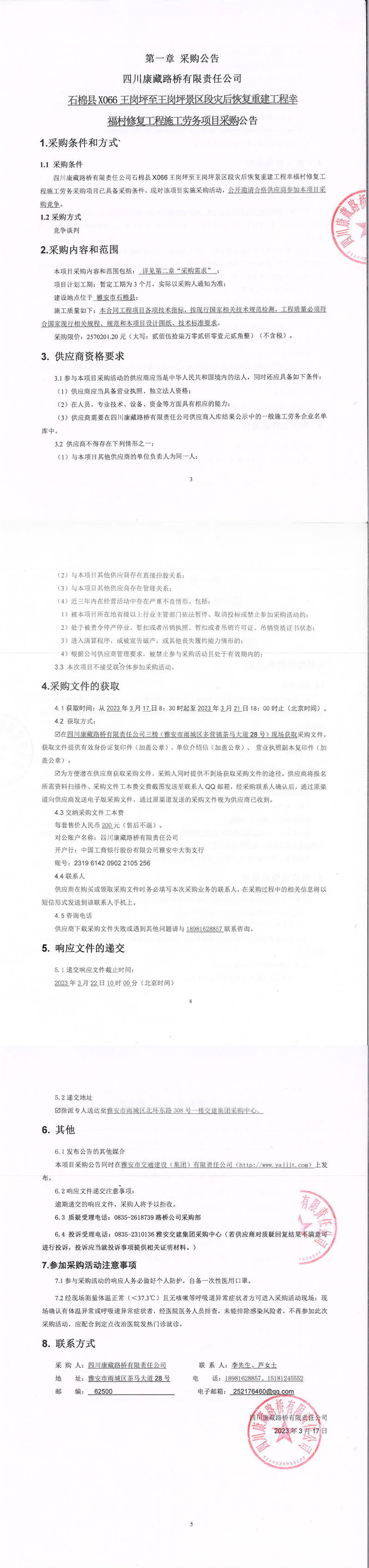 四川康藏路橋有限責任公司石棉縣X066王崗坪至王崗坪景區(qū)段災后恢復重建工程幸福村修復工程施工勞務項目采購公告