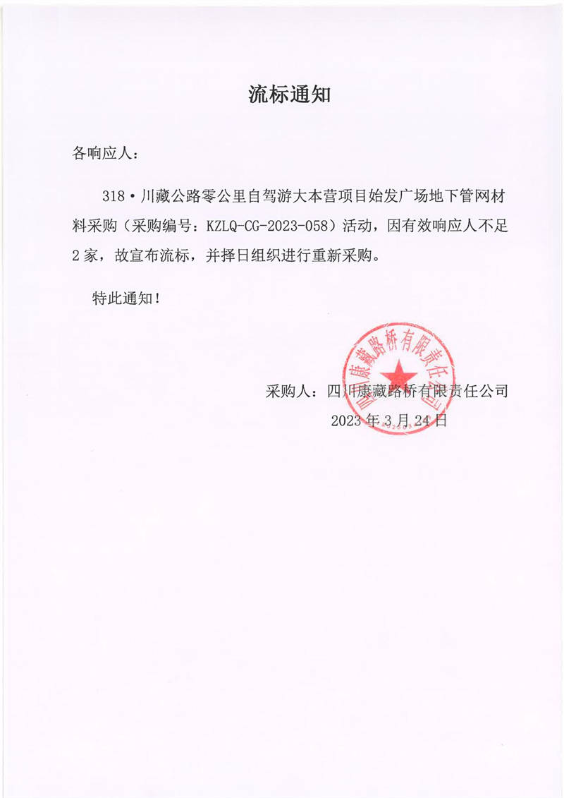 四川康藏路橋有限責(zé)任公司318·川藏公路零公里自駕游大本營項目始發(fā)廣場地下管網(wǎng)材料采購流標(biāo)通知